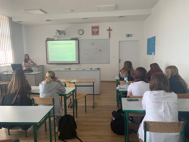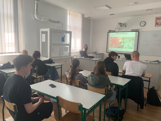 Tematem lekcji były organizmy inwazyjne w naszym otoczeniu. Najpierw w trakcie wykładu uczniowie zapoznali się z najpowszechniej występującymi organizmami inwazyjnymi w Polsce (np barszcz Sosnowskiego, dąb czerwony, robinia akacjowa, czeremcha, nawłoć czy niecierpek drobnokwiatowy). Dowiedzieliśmy się również gdzie można zgłaszać stanowiska występowania najniebezpieczniejszych organizmów inwazyjnych. W drugiej części zajęć uczniowie klasy 2a poszli na zajęcia w terenie. W trakcie tej lekcji w okolicy naszej szkoły znaleźliśmy stanowiska występowania przynajmniej 5 gatunków inwazyjnych. Dużym zaskoczeniem dla naszej przewodniczki było odkrycie dużego stanowiska kosaćca żółtego i wyki żółtej na terenie Odolanowa. Spacer uważamy za udany, zresztą spójrzcie sami na zdjęcia. Zajęcia zorganizowała p. A. Ćwiklińska